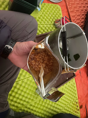 今回の山行でよく食べていくパスタ、ペンネ。今夜はピーマン、ナス、ベーコンが入っていて豪華。食料係が中々優秀で、山行全体を通して美味しいものばかり。パスタも味が豊富で飽きずに食べることが出来る。軽量化とはかけ離れているが食事の面で辛いことはないだろう。皆がタフなおかげで実現できた。